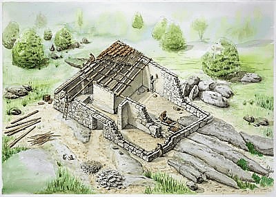 Reconstrucción de una de las casas encontradas. Fuente: dibujos de Joaquín Vila y CosasdeHoyo.es