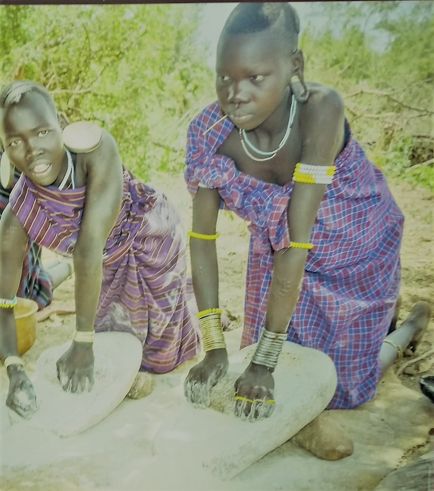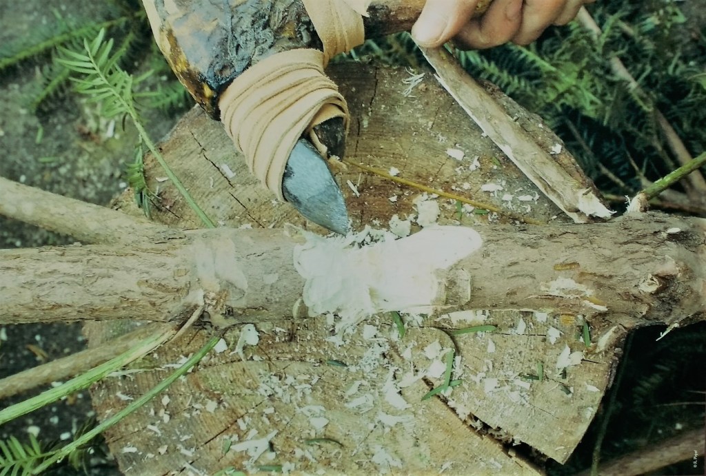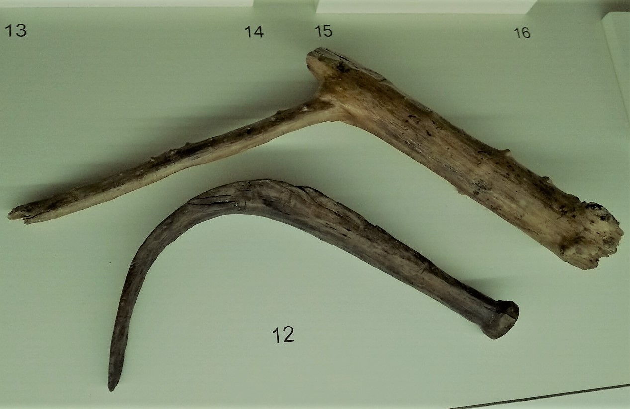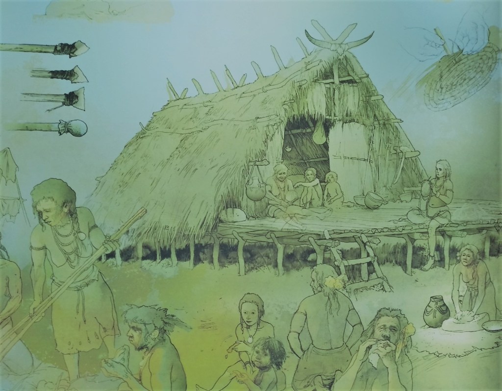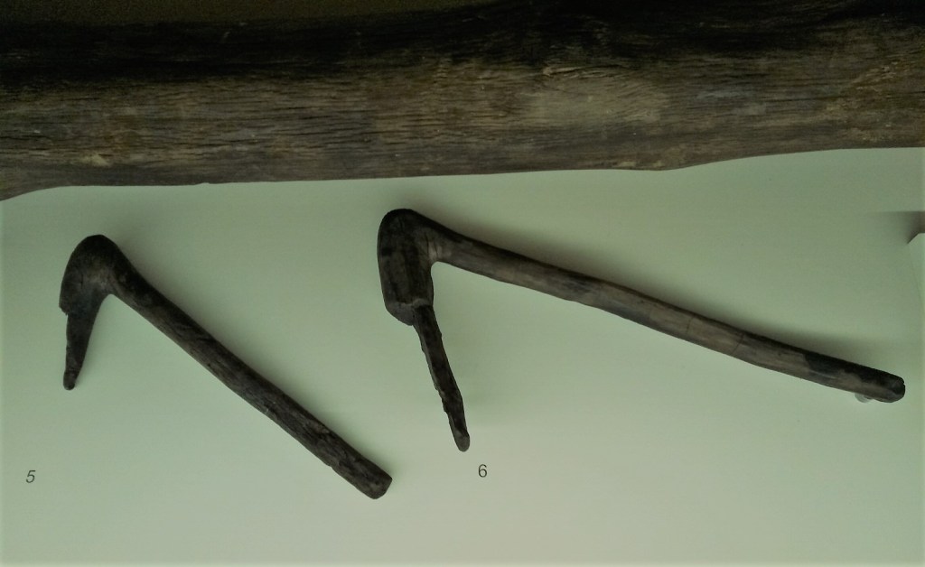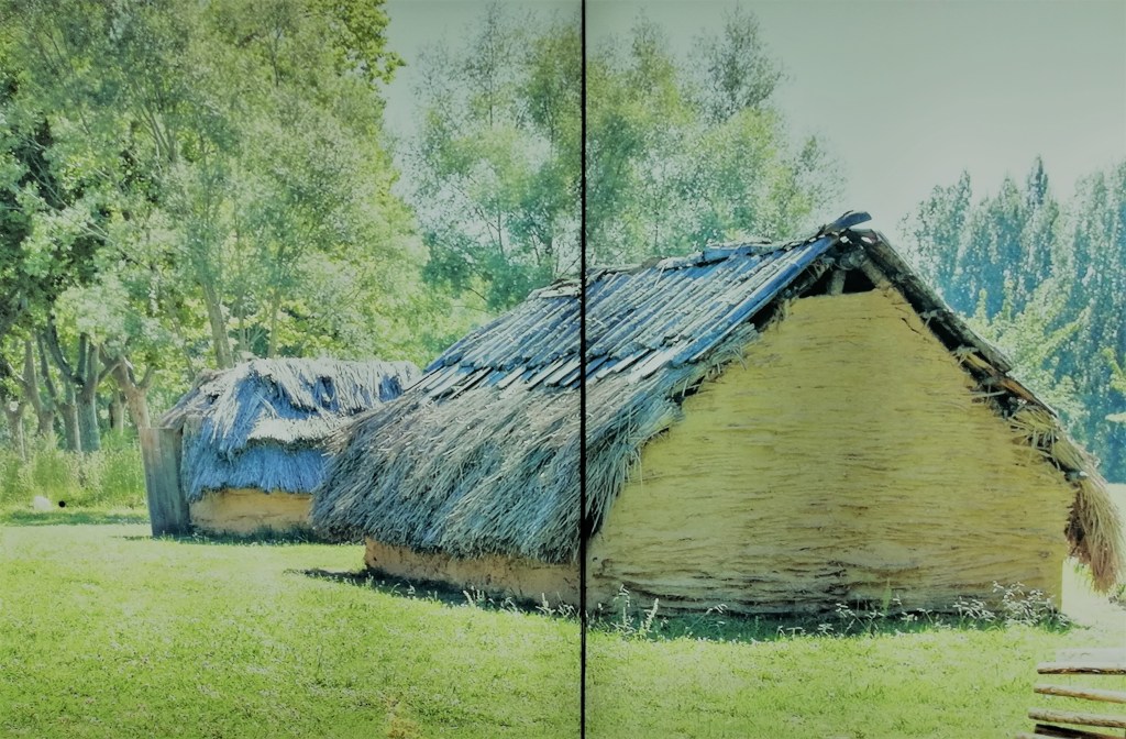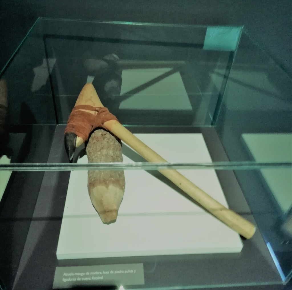 Cuarto: lo primero que me pregunto cuando visito un yacimiento arqueológico o una exposición de arqueología es cómo vivían las personas que lo poblaban, qué hacían o para qué servían los objetos que se muestran. En definitiva, qué era lo cotidiano, cuál era el día a día. En la exposición había bastantes ejemplos: los restos originales de un mango de madera de una azuela lleva a una reconstrucción del instrumento añadiendo las piezas que le faltan para hacerlo funcional. El instrumento se relaciona con la construcción de las casa de madera sobre el entorno lacustre: se usa para desbrozar madera y realizar muescas de unión entre los troncos. Un buen dibujo detalla la edificación de una cabaña, alrededor de la cual empiezan a realizarse las tareas cotidianas del poblado. Una de ellas es moler el trigo para la elaboración de harina que a su vez servirá para elaborar las correspondientes tortas o panes base de la alimentación de estas gentes. Otras fotografías muestran pueblos actuales realizando la misma tarea; otros paneles recogen la reconstrucción de las cabañas que se ha hecho in situ a raíz de los objetos encontrados.